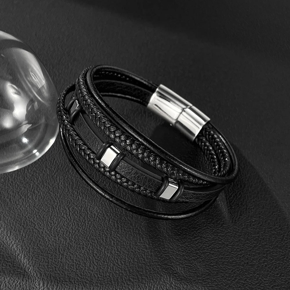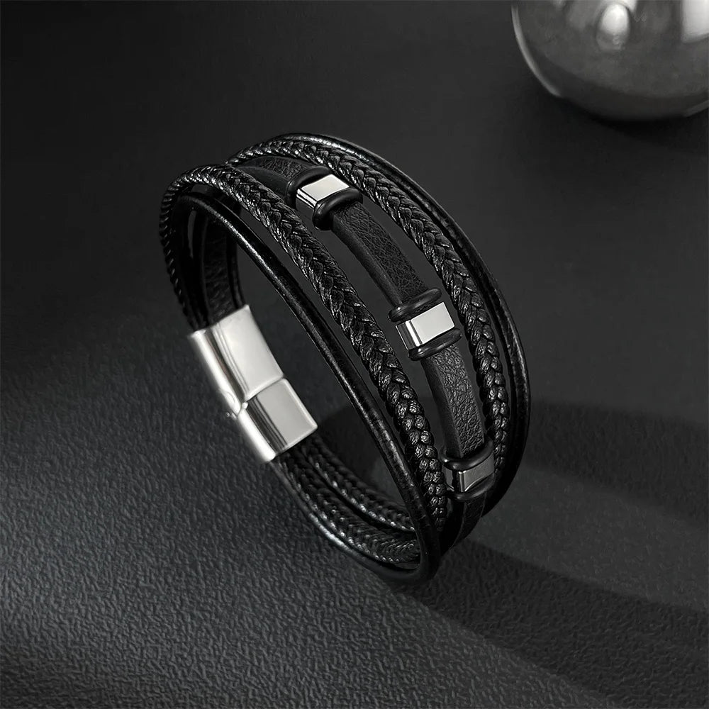 This men’s braided leather bracelet is designed with a multi-layer wrap style, combining casual charm with subtle strength. Made with durable leather, stainless steel, and titanium elements, it offers a clean, masculine look that’s ideal for daily wear.