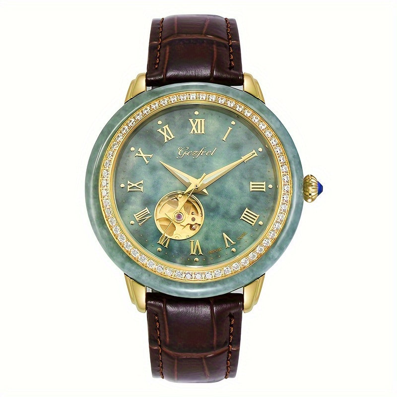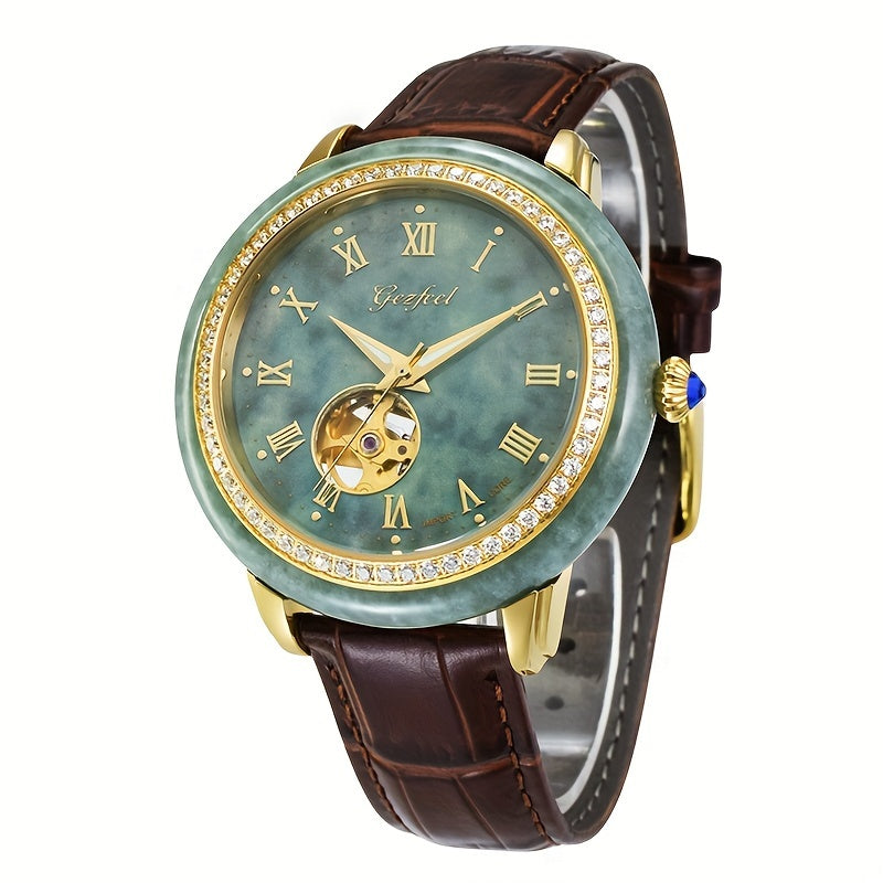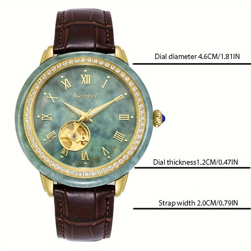 [GEZFEEL Mechanical Watch] GEZFEEL Mechanical Self-Winding Watch - Fashionable Stainless Steel Case Automatic Watch with Round Hollow Emerald Dial, Genuine Leather Strap, Waterproof - Without Battery