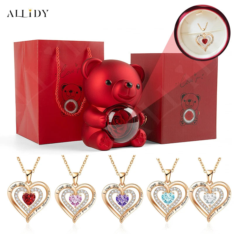 Luxury Red Zircon Pendant Necklaces With Rose Bear Gift Box For Girlfriend Women I Love You Gifts 2024 Trendy Wedding Jewelry