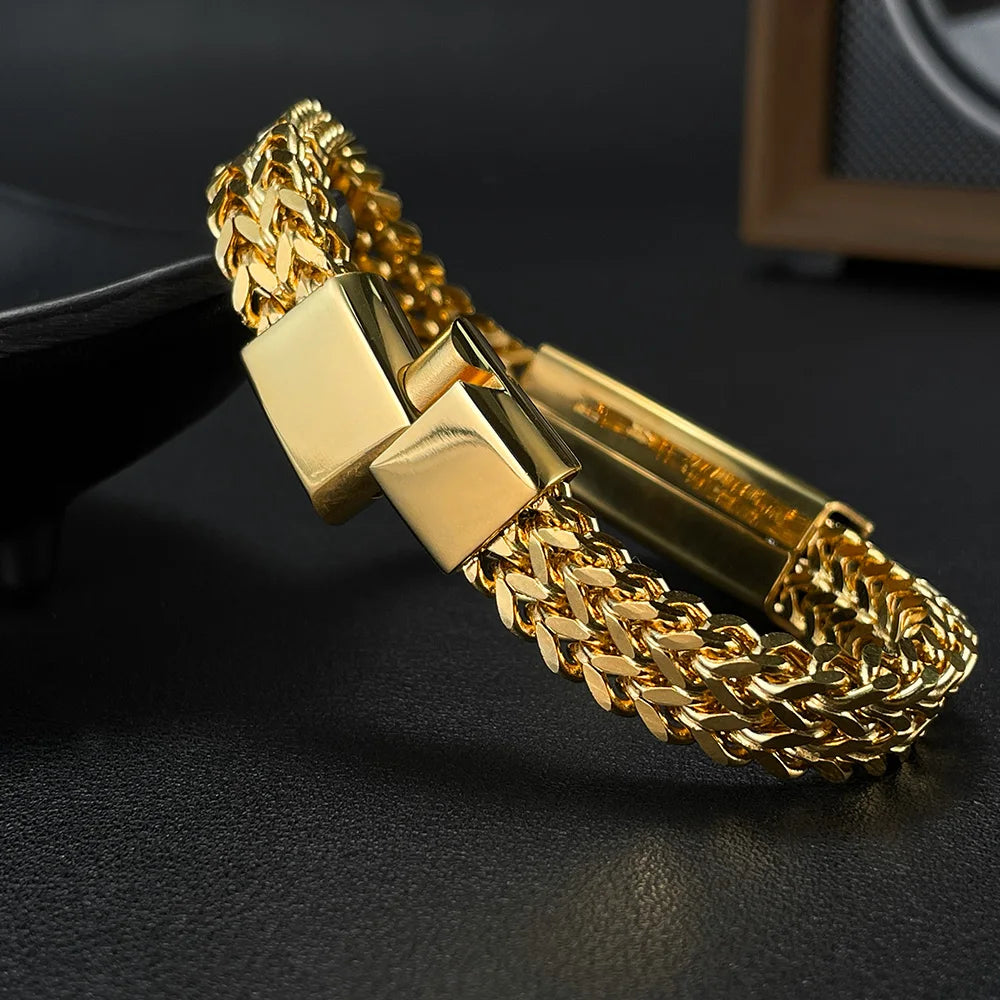 Crafted from durable titanium-plated stainless steel, it offers a brilliant gold finish that won’t fade or rust, perfect for daily wear or layered styling. Its polished, masculine curb chain design delivers weight and presence without being bulky.