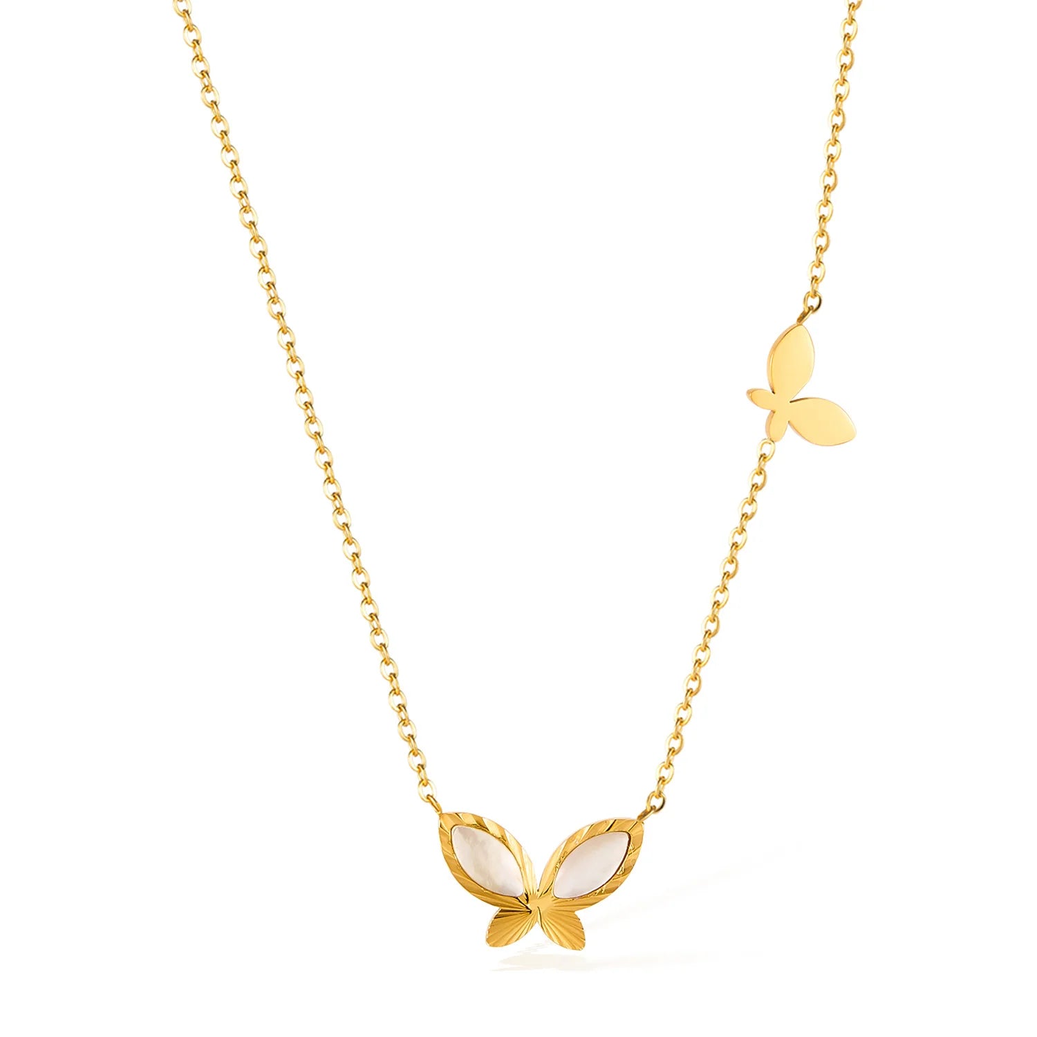 Grace your neckline with the delicate charm of this butterfly necklace. Crafted from high-quality stainless steel and detailed with shimmering mother-of-pearl, it captures both elegance and whimsy. The minimalist clavicle chain brings sophistication to everyday looks while making it easy to layer with other pieces. A chic accessory for modern women who love unique and refined jewelry.