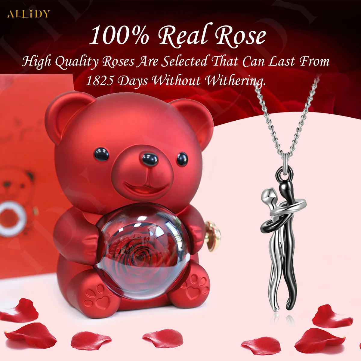 Hip Hop Embrace Couple Pendant Necklace Adjustable Hugging Pendant Necklace and Eternal Rose Bear Jewelry Box Valentine Day Gift