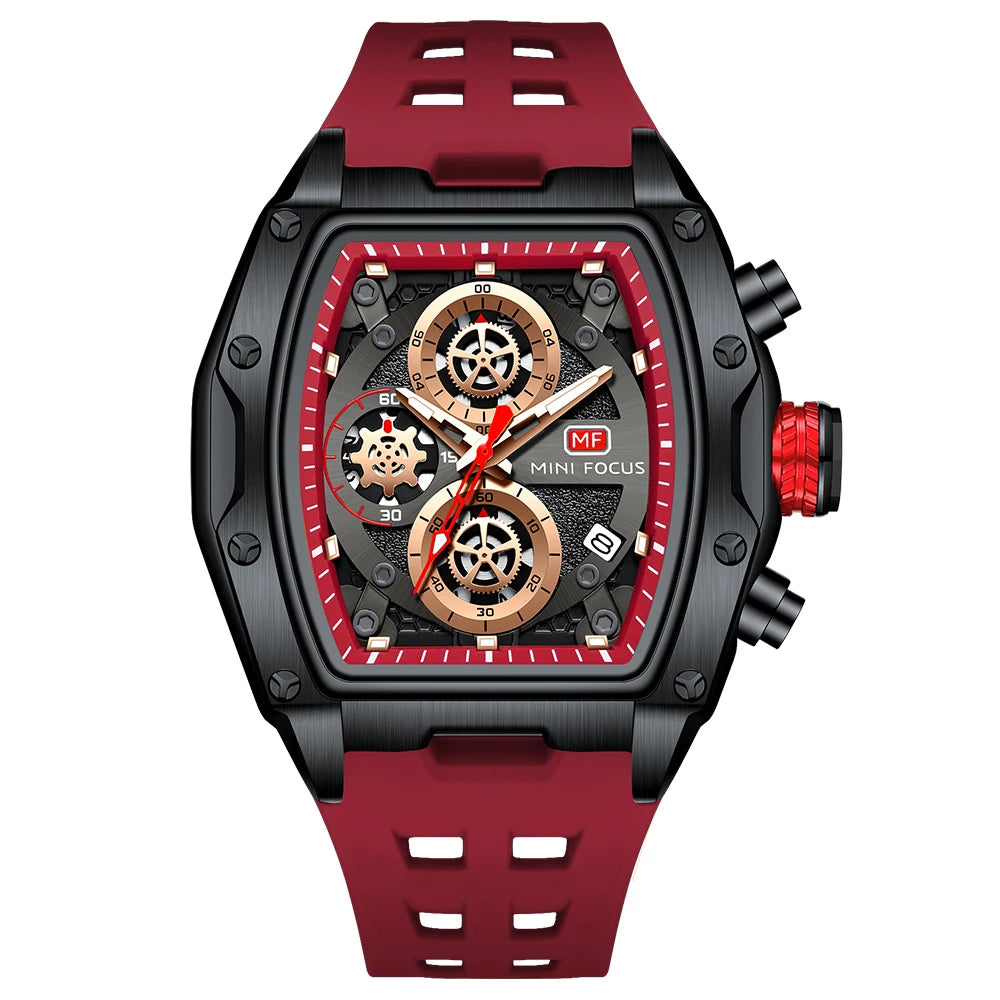 Introducing the MINIFOCUS Luxury Men’s Racing Sports Watch, crafted for men who demand performance, style, and bold design. This timepiece features a skeleton barrel dial that showcases the internal design while maintaining a sleek, professional look.