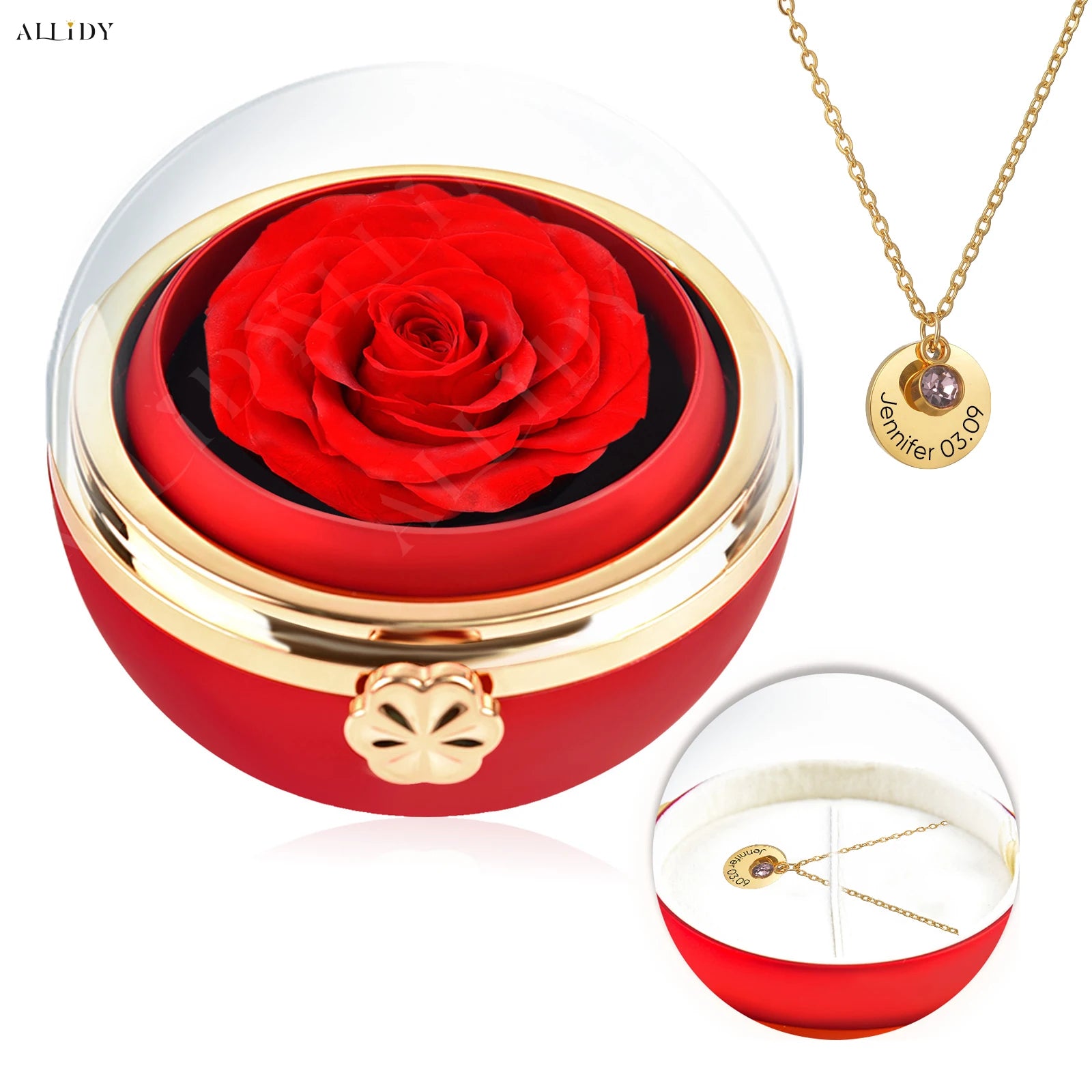 Stainless Steel Personalized Engraved Round Piece Birthday Stone Pendant Necklace Preserved Rose Round Rotating Flower Box Gifts