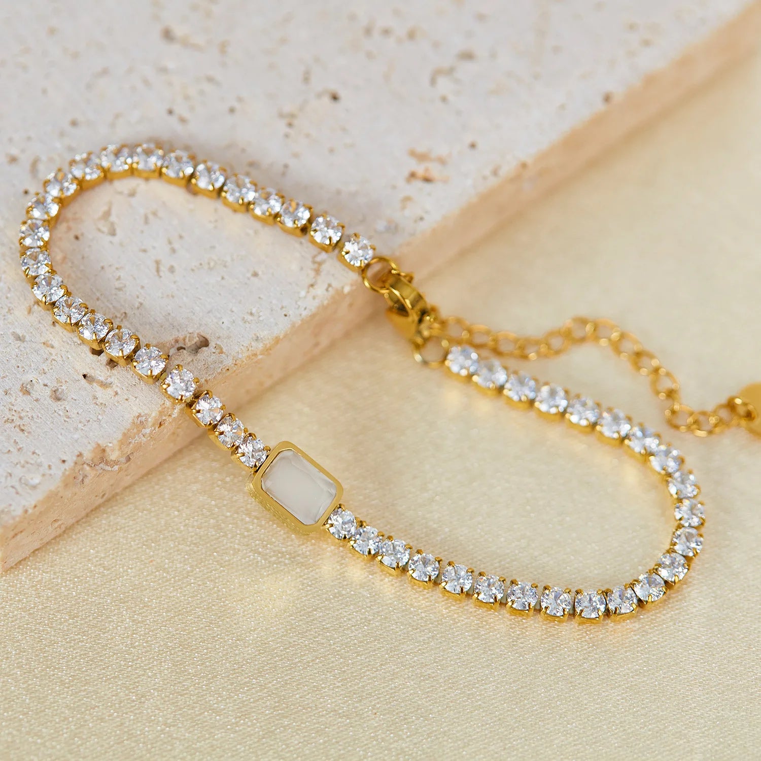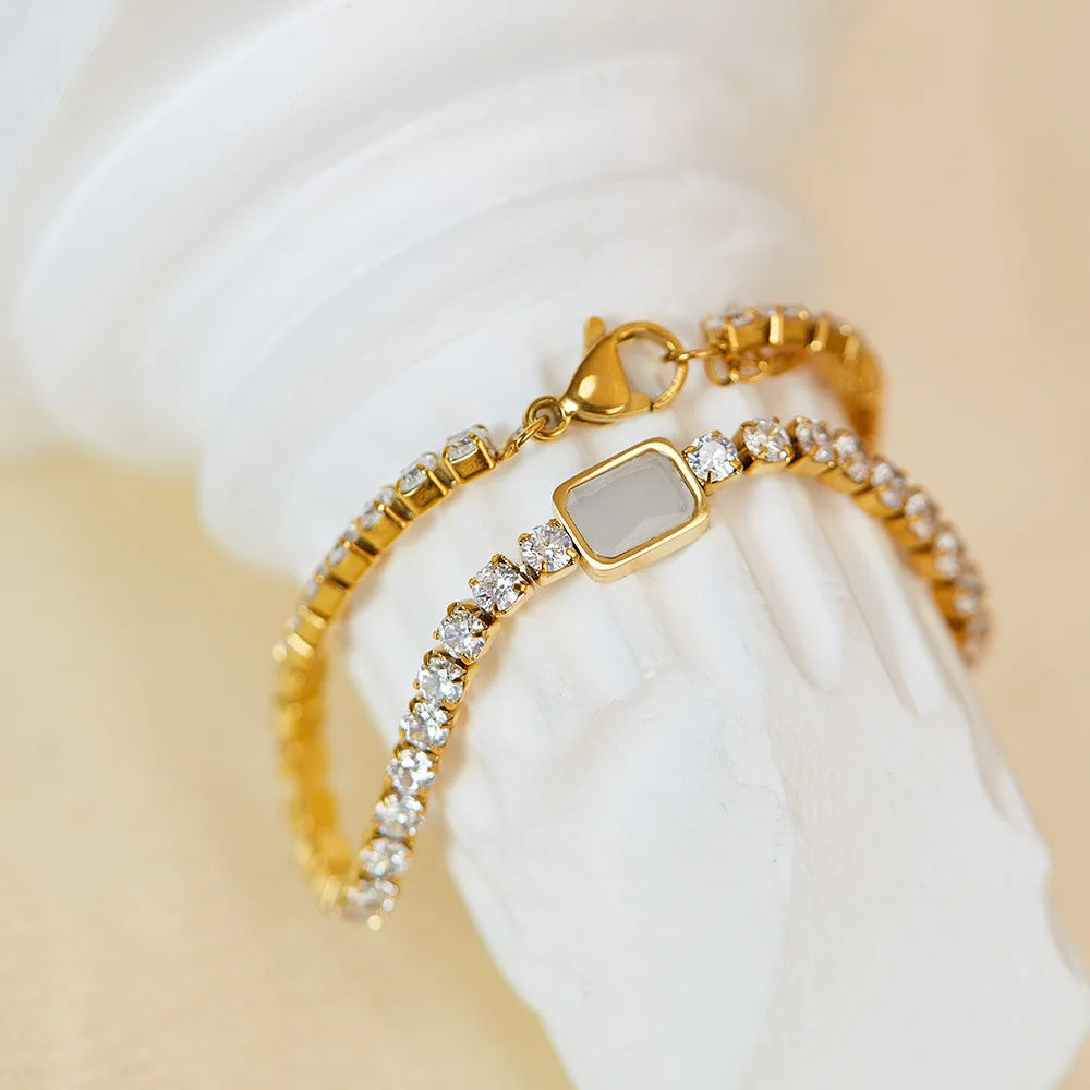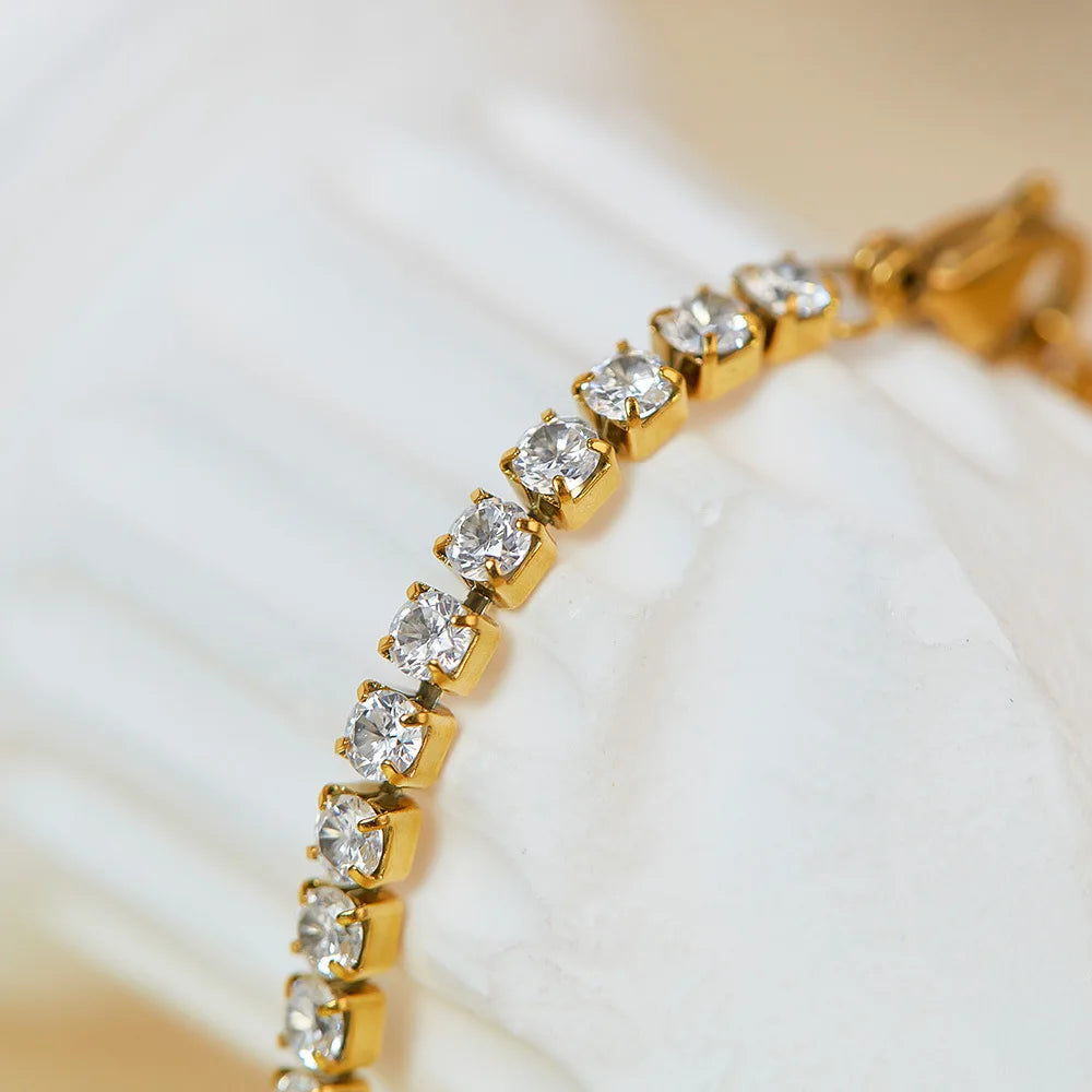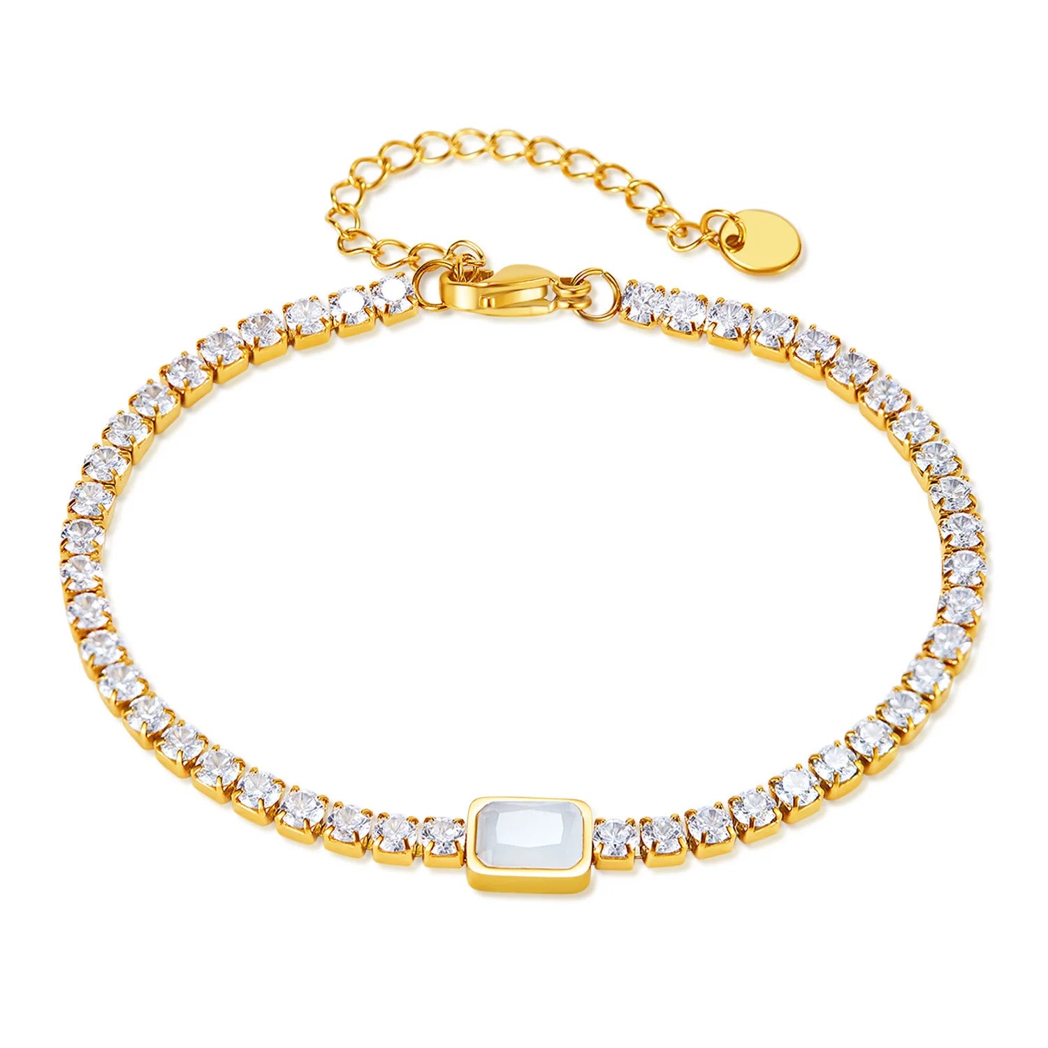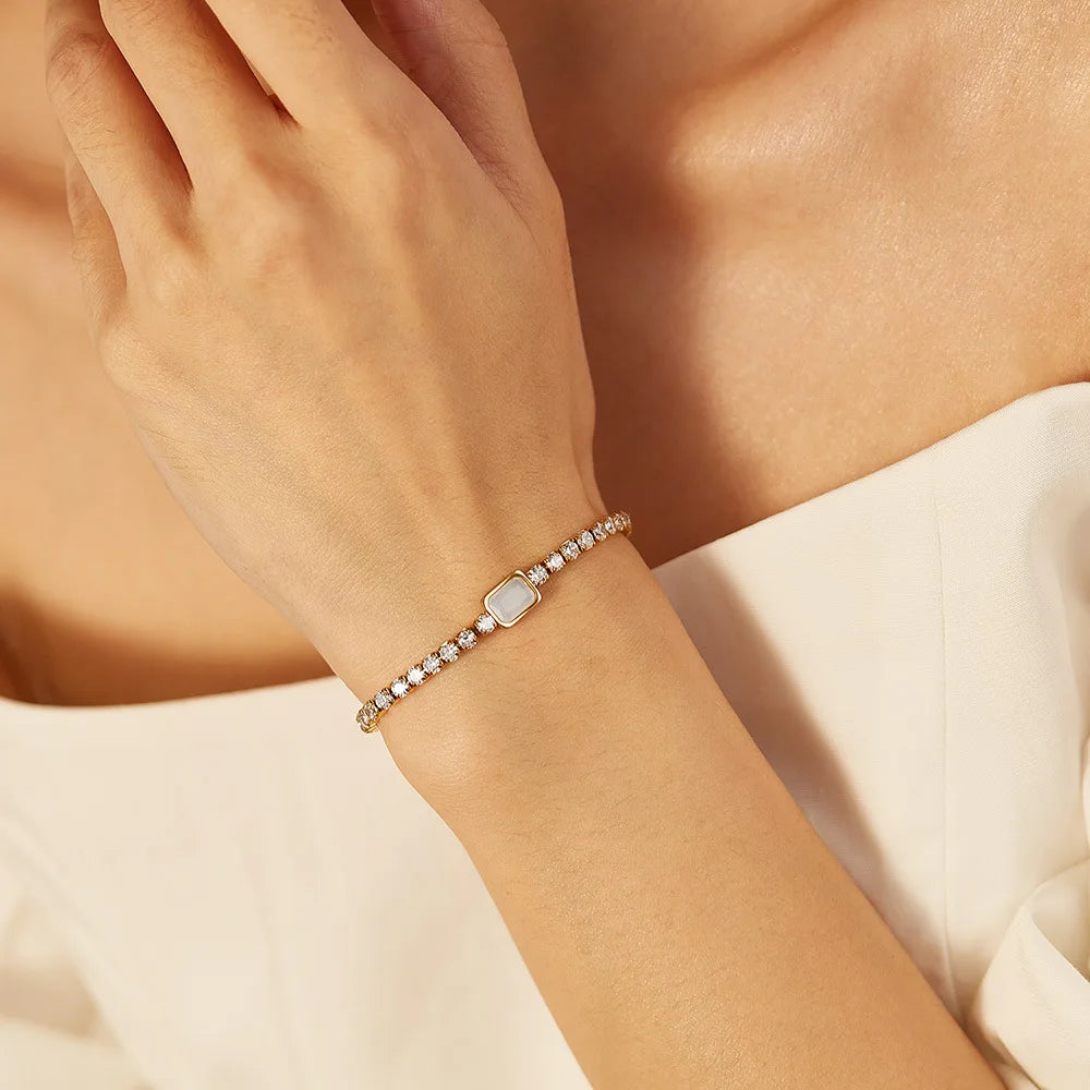 This gold-plated bracelet blends high-polish stainless steel with a shimmering zircon centerpiece. The titanium build ensures durability and skin-friendliness, while the minimalist yet refined design complements both casual and formal outfits. Lightweight, hypoallergenic, and waterproof – made for everyday elegance.