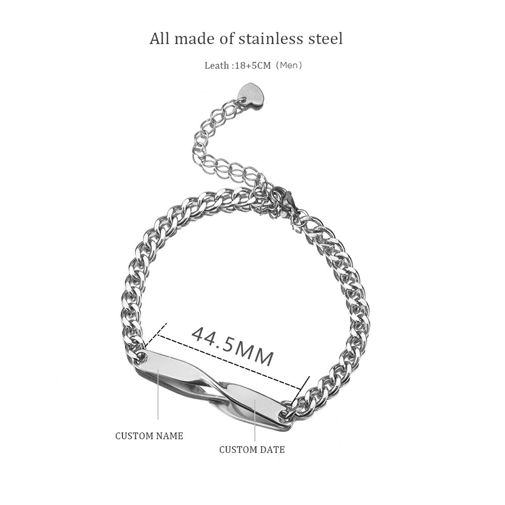 The custom engraved couples bracelet is the perfect symbol of your endless love. The bracelet features an infinity twist design, symbolizing the everlasting bond and commitment between you.