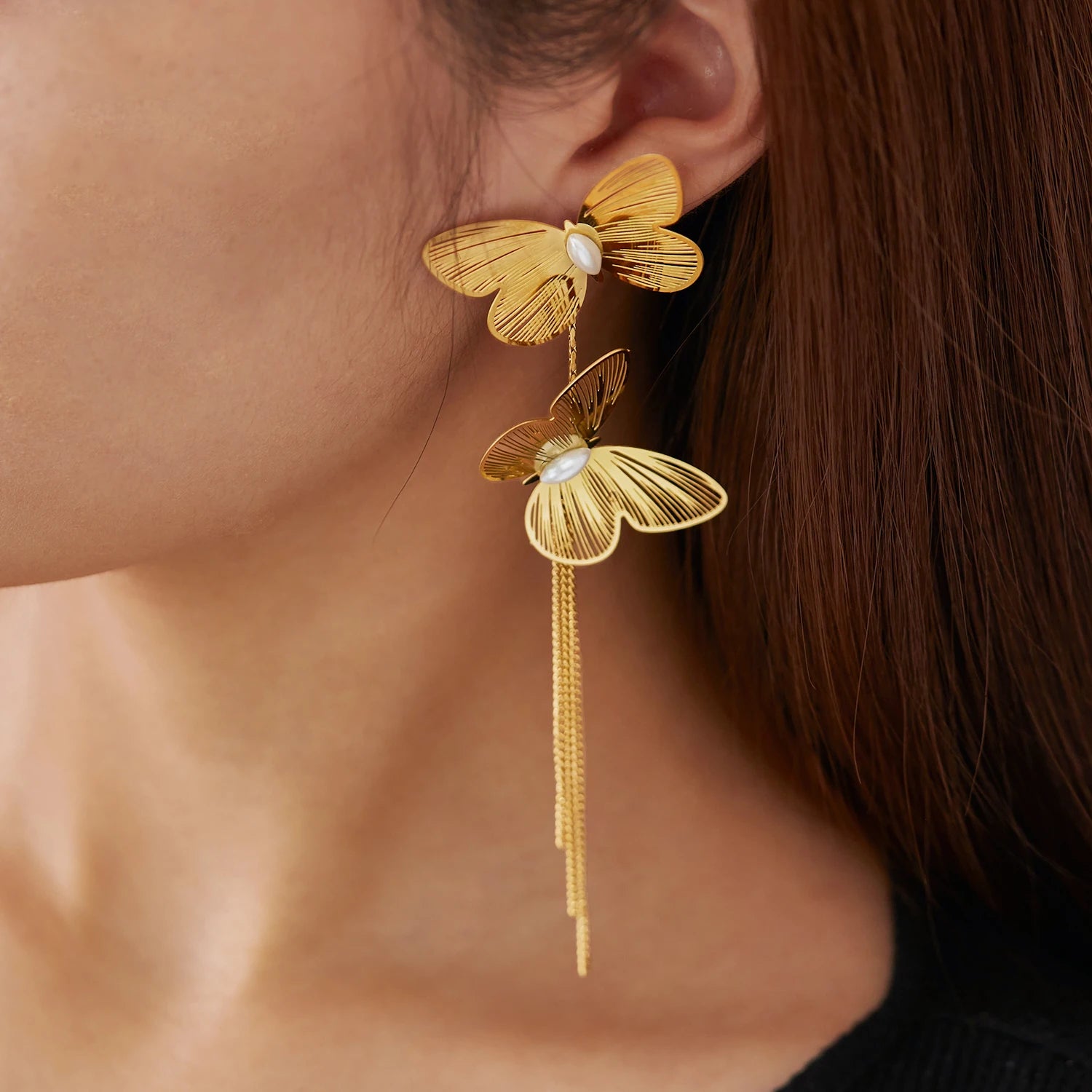 #butterflyearrings #luxuryjewelryforwomen #frenchearrings #statementearrings #tasseljewelry #stainlesssteeltitanium #boldwomensearrings #hypoallergenicearrings #giftsforher #elegantaccessories