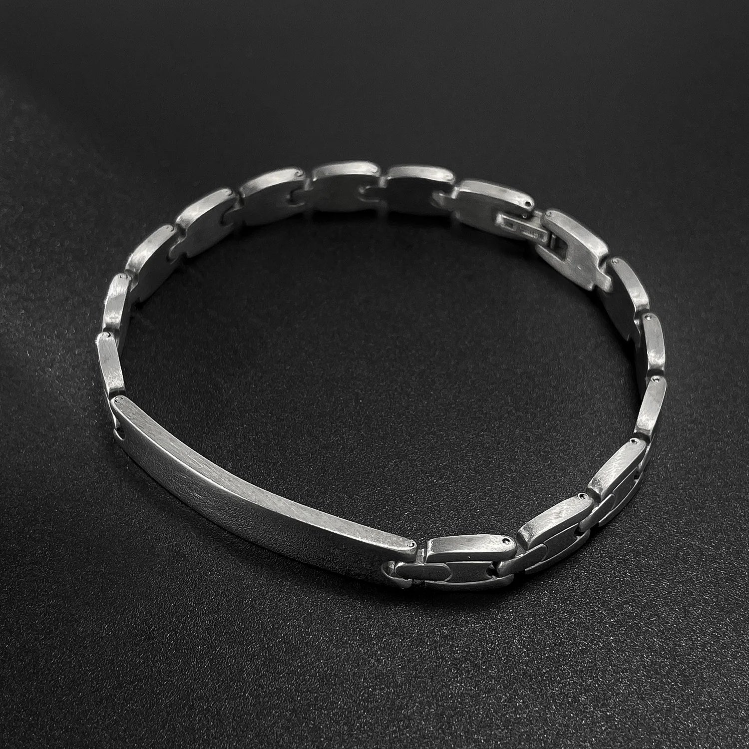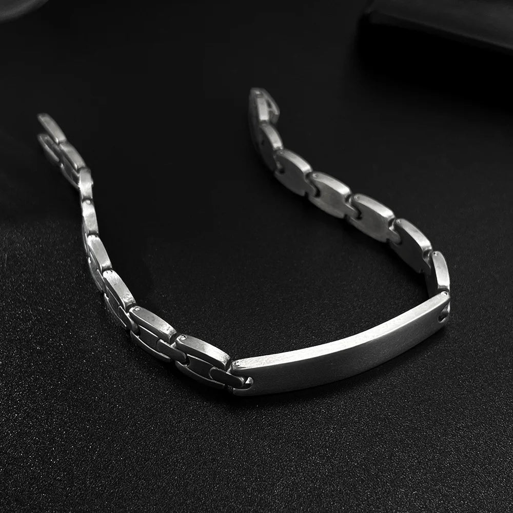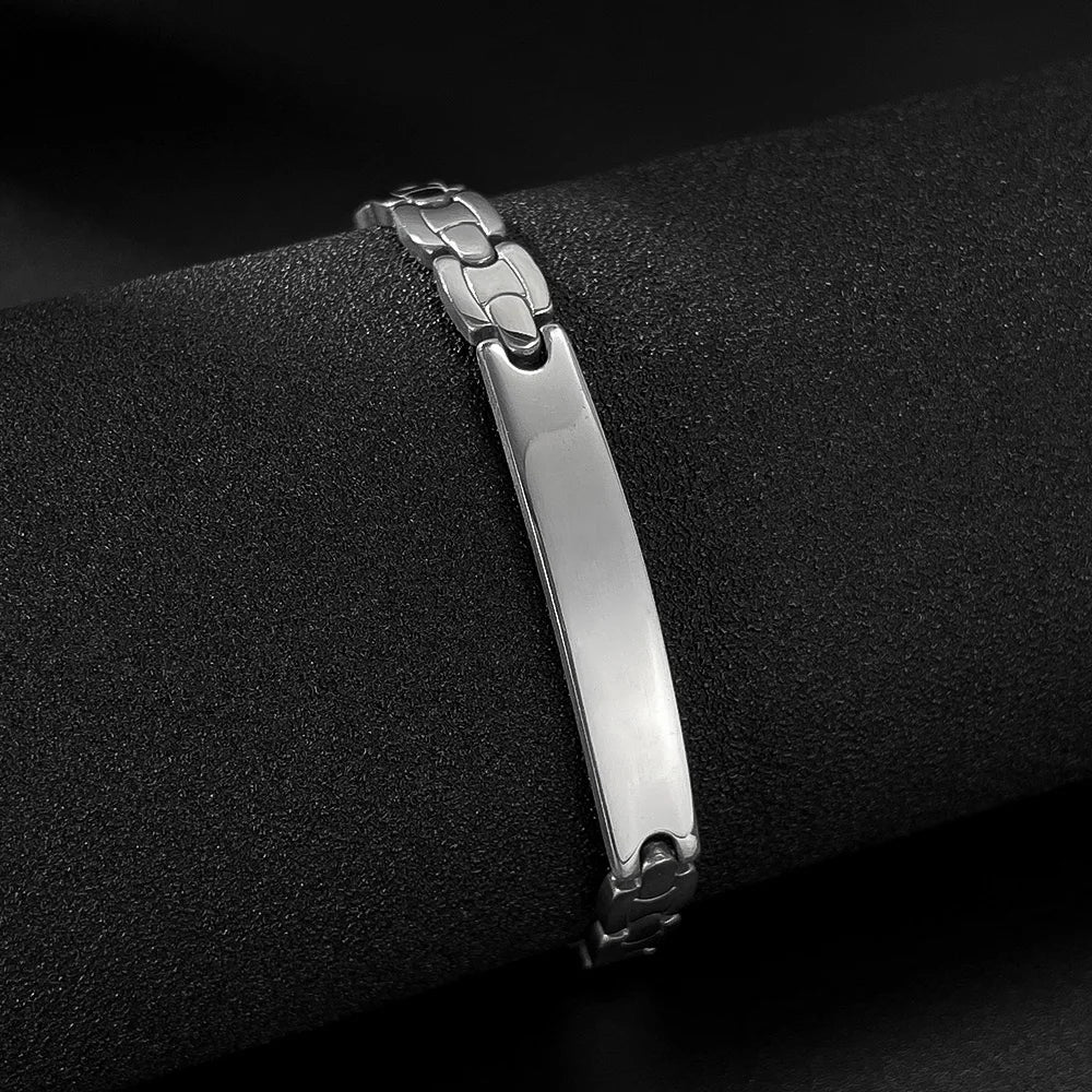 This men’s hip hop bracelet blends clean minimalism with urban edge, featuring a smooth curved plate design in high-polish titanium stainless steel. Its streamlined structure reflects both strength and style, perfect for men who appreciate modern, understated bling.
