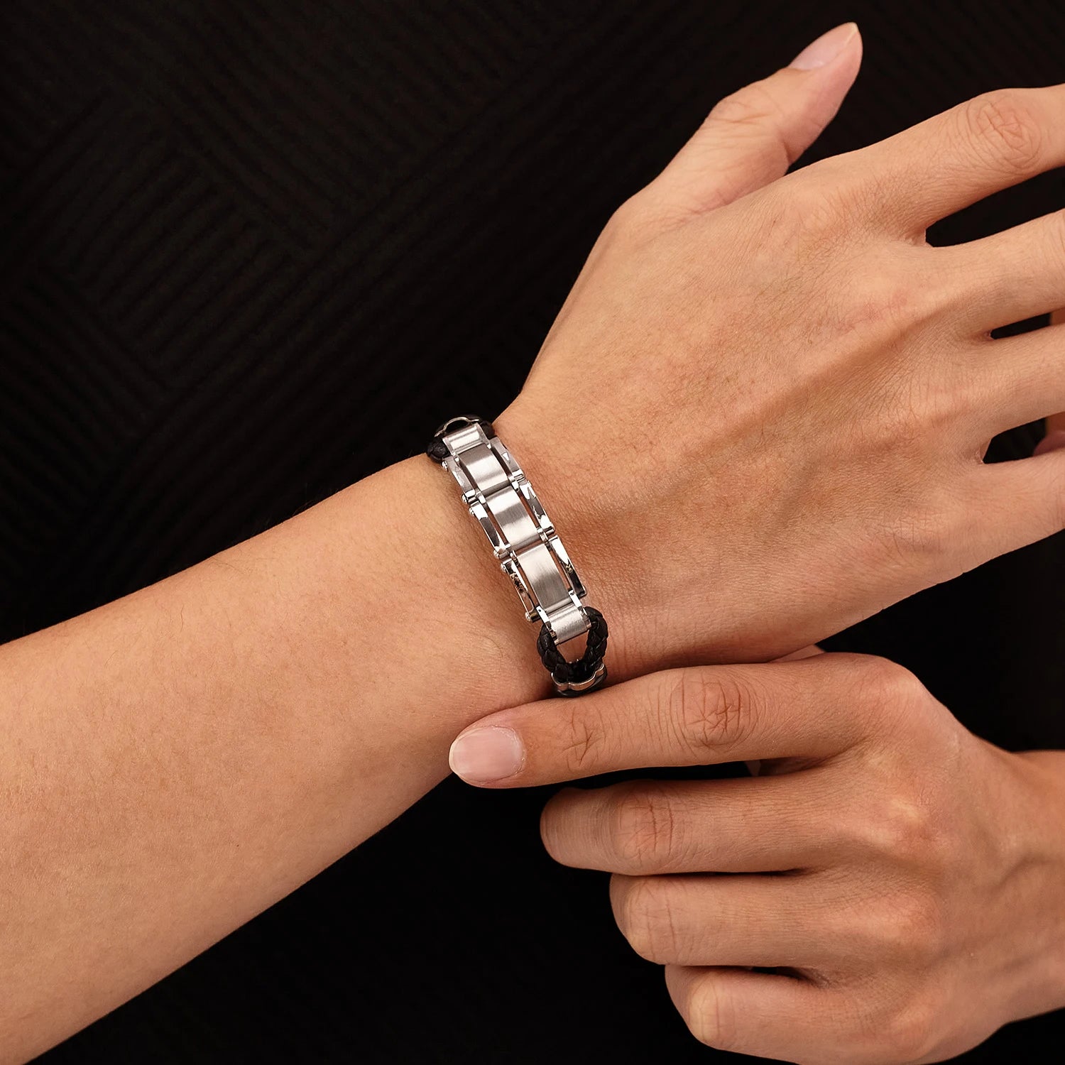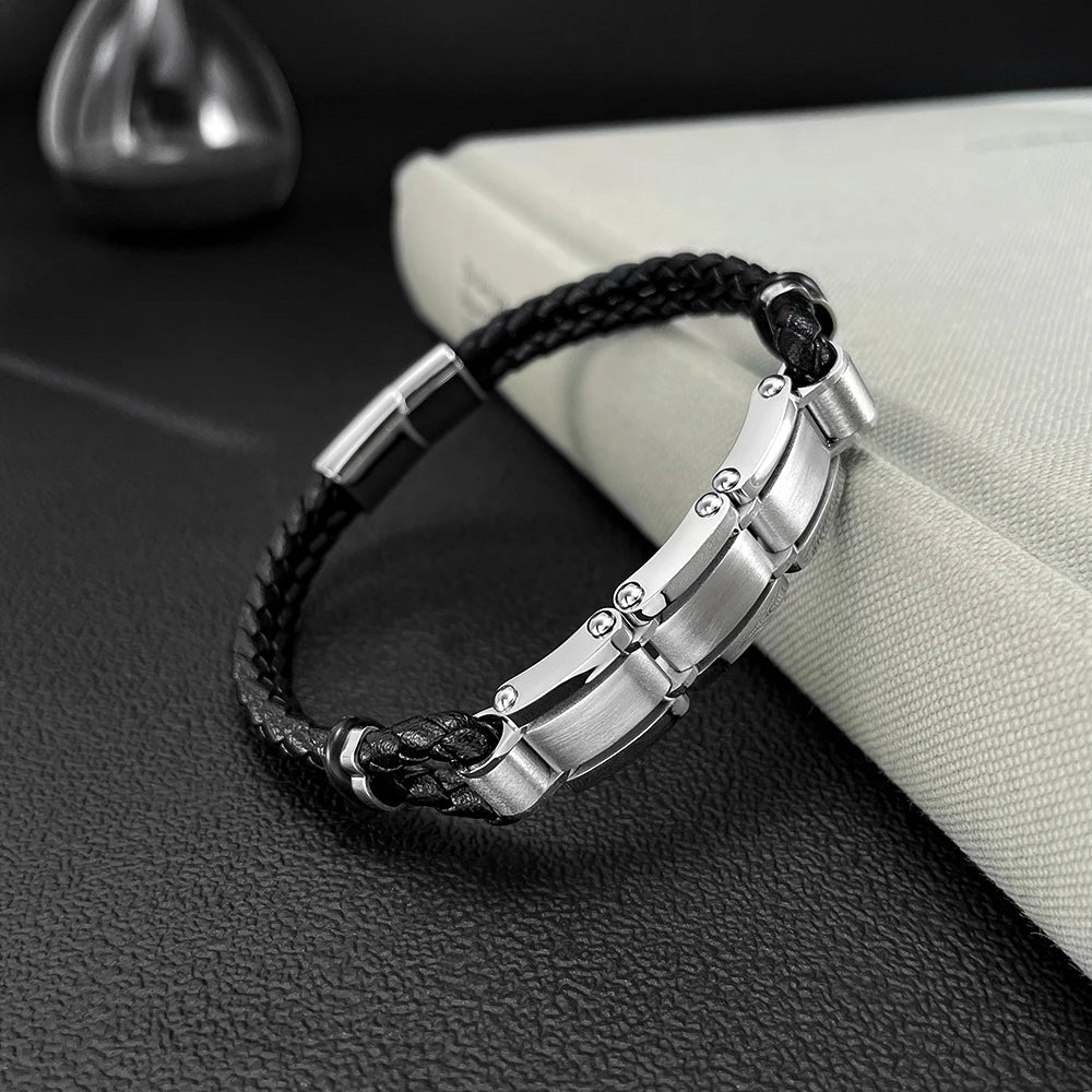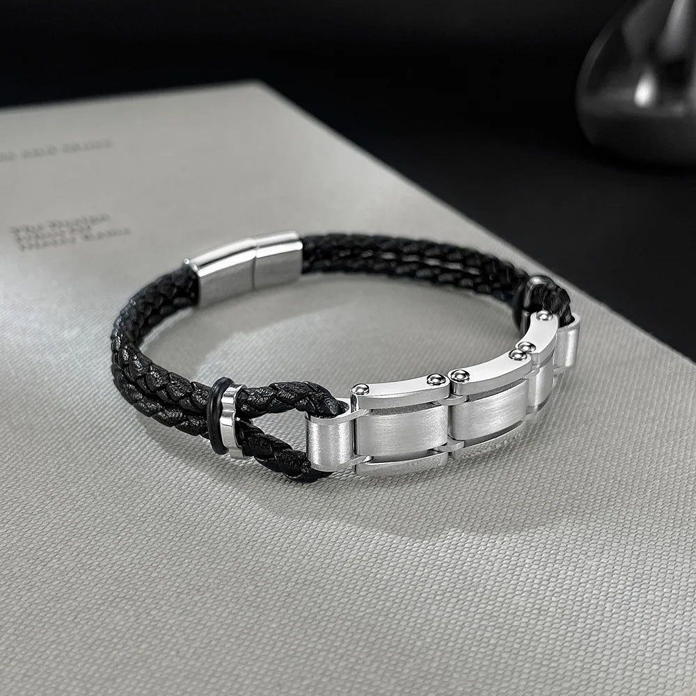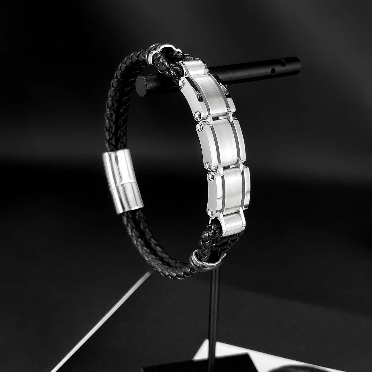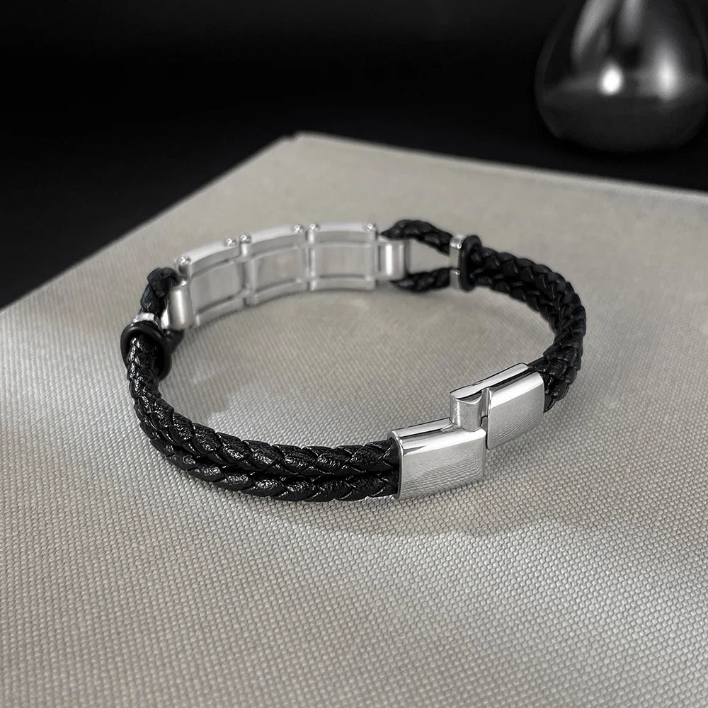 This men’s leather bracelet blends biker chain inspiration with modern streetwear flair. The double-layer braided leather strap offers durability and texture, while the stainless steel centerpiece adds a bold and creative twist. Designed with hip hop and urban style in mind, this piece is ideal for fashion-forward men who value edgy, rugged details.