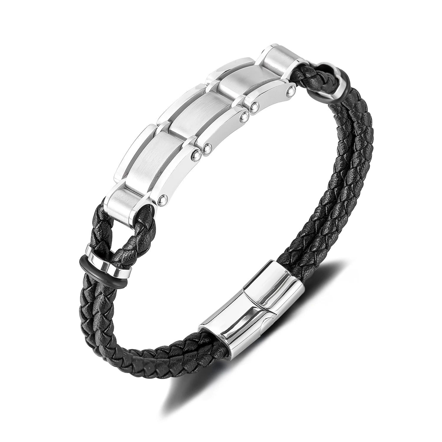 Men’s Biker Chain Leather Bracelet – Double Layer Braided Wristband with Creative Stainless Steel Design, Hip Hop Style