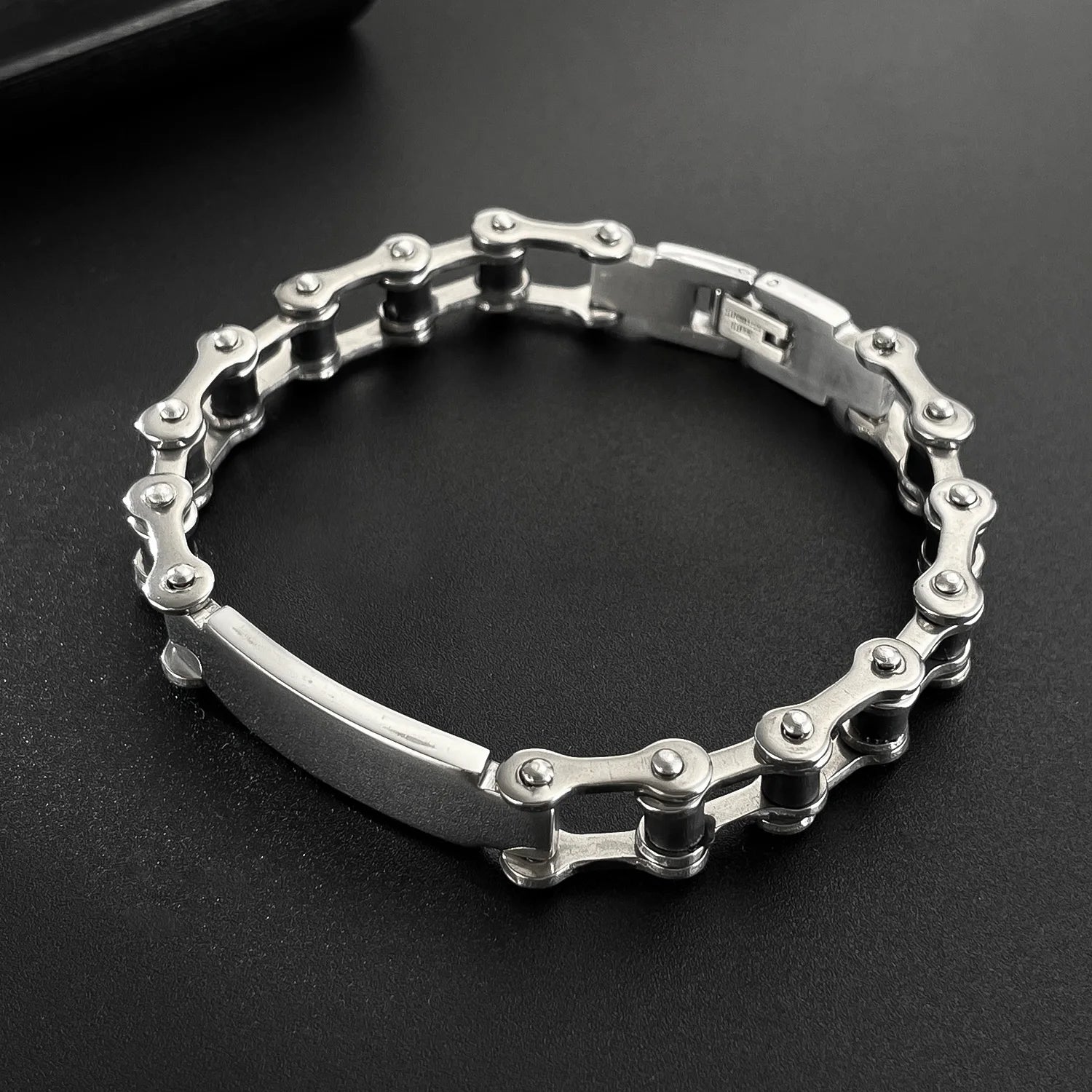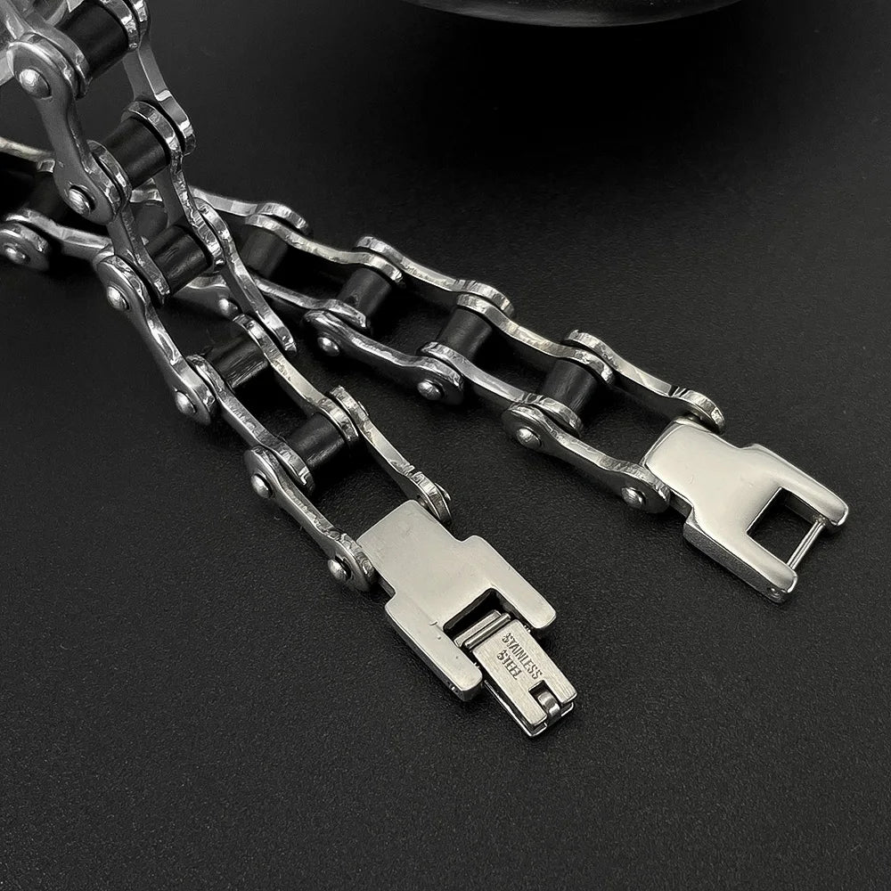 This motorcycle chain-inspired bracelet brings rugged machinery aesthetics into everyday fashion. Crafted from high-polish stainless steel and titanium, it features a bold hollowed link design with a smooth, clean surface — offering both strength and style.