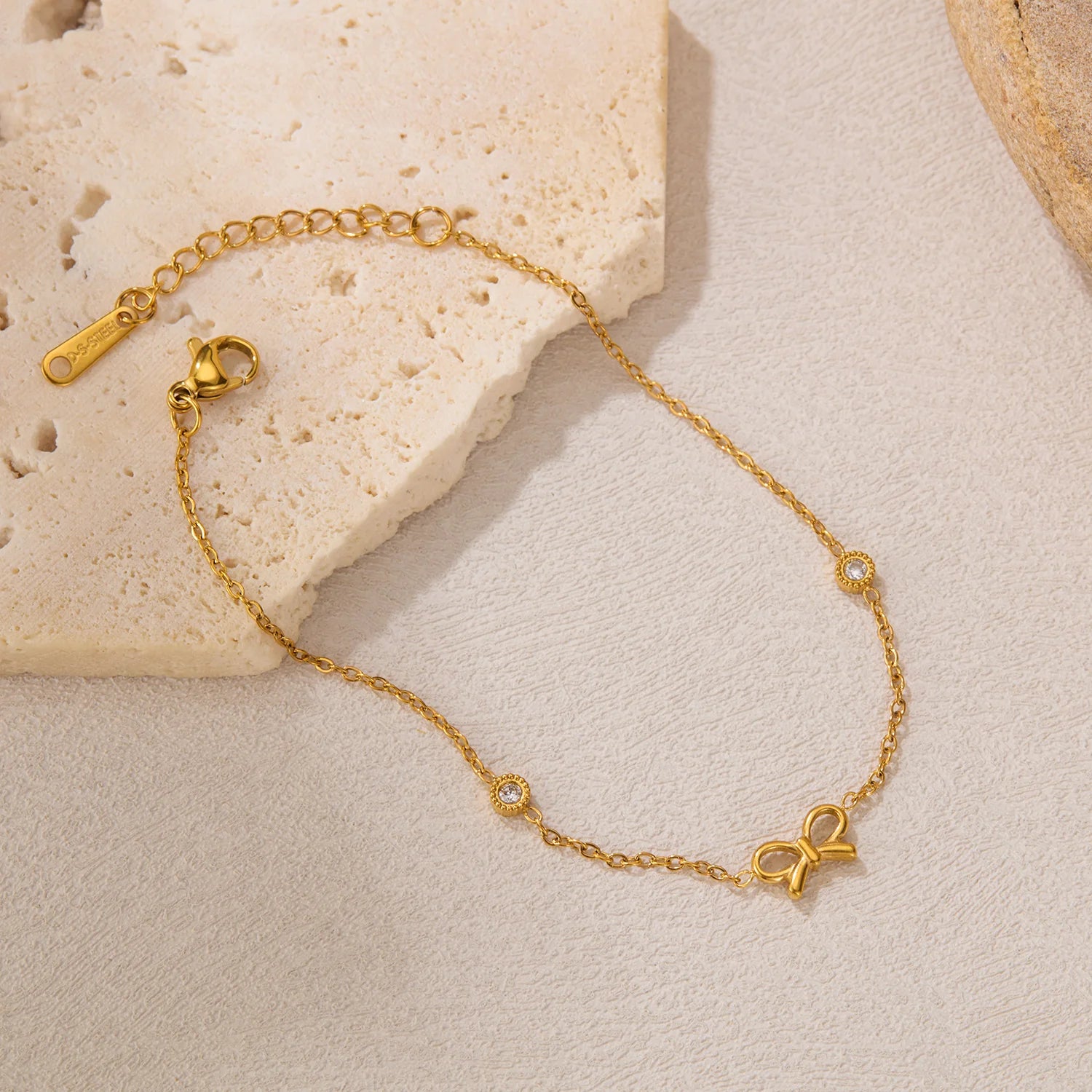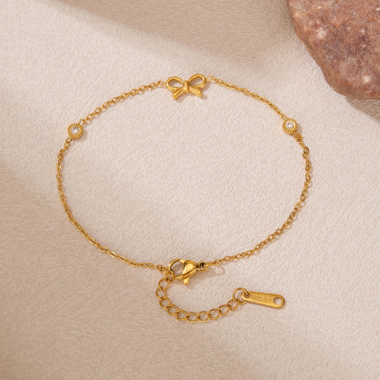 This stylish women’s bracelet features a delicate bowknot charm symbolizing femininity and elegance. Crafted from high-quality stainless steel with a titanium coating, it offers a subtle sheen and long-lasting durability. Its minimalist design is perfect for everyday wear while still making a graceful statement. The adjustable clasp ensures a secure and comfortable fit for any wrist size.